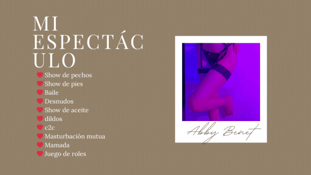 Puoi RICHIEDERE UN APPUNTAMENTO con Abby Benet quando ti è più comodo. Tutto è impostato sul tuo fuso orario e sulle tue ore locali. Lei riceverà la tua richiesta e la accetterà se la sua agenda è libera. Riceverai una conferma via email e potrai prepararti per la tua esperienza piccante.
